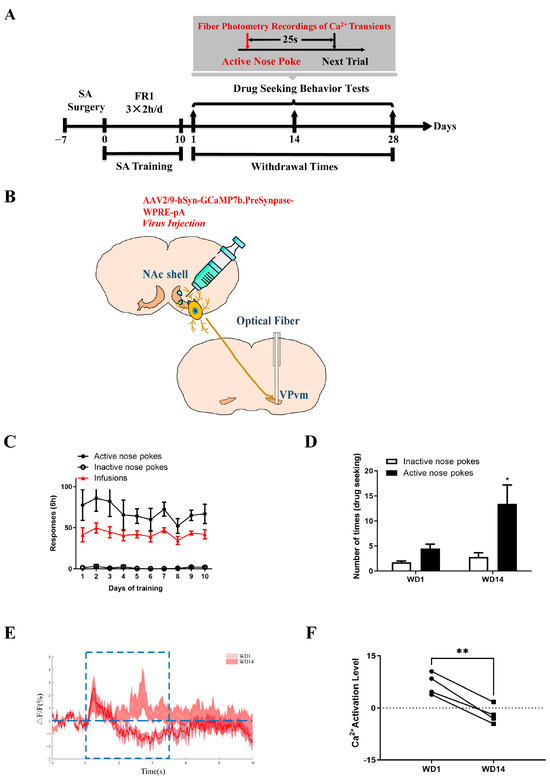 Functional alterations in neural projections from NAc shell to VPvm detected by in vivo fiber photometry. (A) Behavioral training protocol; (B) Schematic representation of virus injection and calcium fiber embedding; (C) Behavioral training process of the animals; (D) Drug-seeking behavior test during fiber photometry, * p < 0.05; (E,F) Neuronal activation in VPvm during the active nose poking before and after withdrawal, number of experimental animals: n = 8. (E) The dotted box shows neuronal activity 5 s after the active nose pokes. (F) Quantitative comparison of neuronal activity, ** p < 0.01.