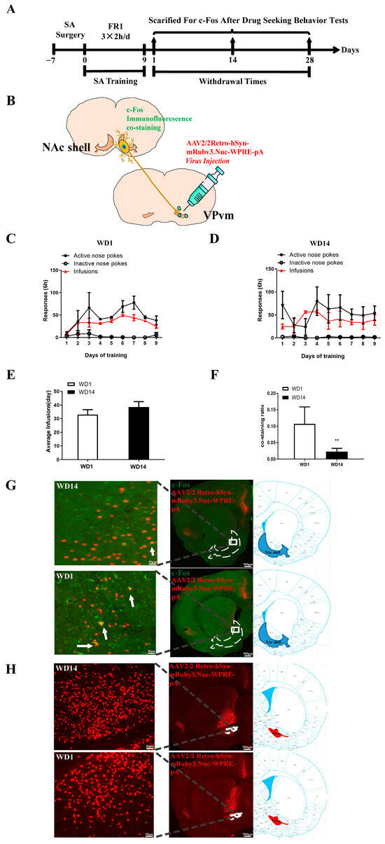 Retrograde tracing and c-Fos co-staining: (A) Flow diagram of experiment; (B) Schematic representation of retrograde tracing and c-Fos co-staining; (C,D) Behavioral training diagram of the WD1 (C) and WD14 (D) rats (two-way ANOVA followed by Tukey’s multiple comparisons test); (E) The total dosage of the WD1 and WD14 during the training, t-test; (F) The co-staining ratio of WD1 and WD14, t-test, ** p < 0.01; (G) Diagram of retrograde tracing virus in WD14 and WD1 rats, the white arrows point to the co-staining cells; (H) Schematic of retrograde tracing virus and c-Fos co-staining on WD14 and WD1 (WD14: n = 6, WD1: n = 10).