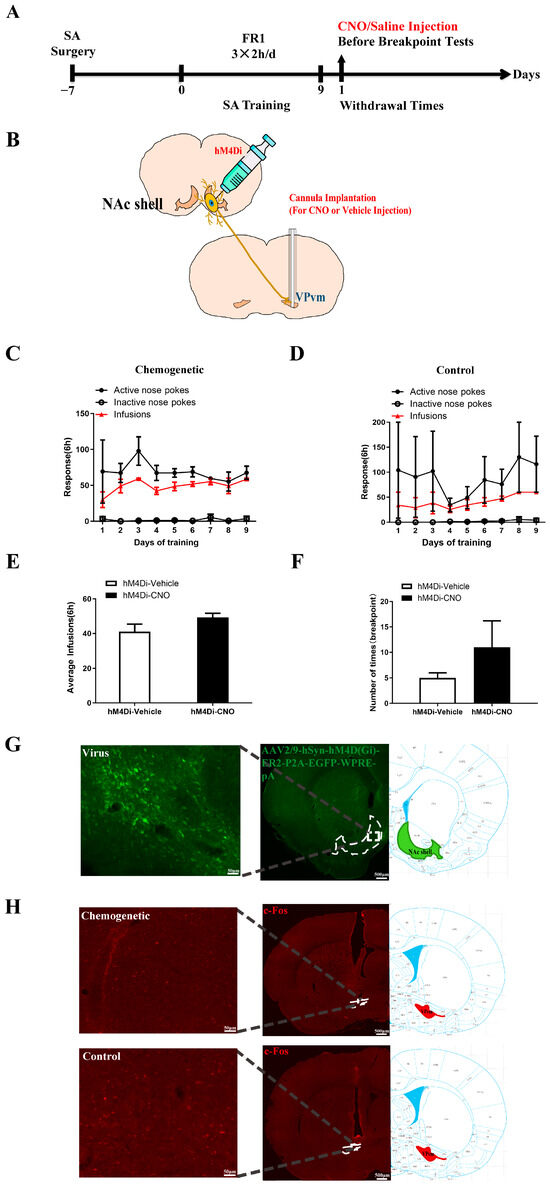 Chemogenetic inhibition of NAc to VP in drug-seeking motivation: (A) Flow diagram of experiment; (B) Schematic representation of chemogenetic inhibition of NAc to VP; (C,D) Behavioral training diagram of the chemogenetic inhibition animals (C) and the control animals (D) (two-way ANOVA followed by Tukey’s multiple comparisons test); (E) The total dosage of the two group animals during the training, t-test; (F) Drug-seeking motivation test, t-test; (G) Chemogenetic virus expression map; (H) Chemogenetic virus effect verified by the expression level of the c-Fos positive cells (up: chemogenetic inhibition, hM4Di-CNO, n = 6; down: control, hM4Di-Vehicle, n = 4).