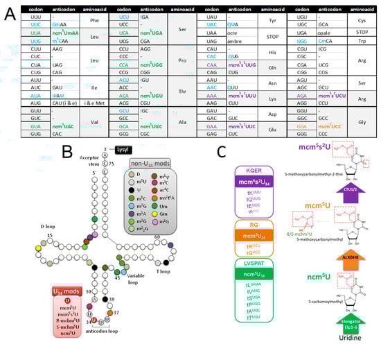 Recently, modifications in the tRNA anticodon loop, particularly at the U34 position of tRNA have emerged as a central pillar in controlling codon bias interpretation by the translational machinery, impacting translation fidelity []. Position 34 in the anticodon loop of tRNAs has indeed been identified as a hot spot for base modifications. The addition of a methoxycarbonylmethyl group at position 5 and a thiol group at position 2 (mcm5s2) of U34 in tRNALysUUU, tRNAGlnUUG, tRNAGluUUC and tRNAArgUCU, by the stepwise action of the Elongator (ELP1-6), ALKBH8, CTU1/2 multi-enzyme complex [] enhances base pairing with A-ending codons that are infrequent in the human genome (Lys AAA; Gln CAA; Glu GAA; Arg AGA codons) (Figure 1C). The first two enzymatic steps (Elongator and ALKBH8) generate mcm5 modifications at the U34 position of two additional tRNAs (tRNAGlyUCC and tRNAArgUCU) whereas Elongator alone can attach carbamoylmethyl (ncm5) to U34 of six different tRNAs (tRNAAlaUGC, tRNAThrUGU, tRNAProUGG, tRNASerUGA, tRNAValUAC, tRNALeuUmAA). Additionally, KIAA1456 [] (a human Trm9 homolog) has been recently shown to generate mcm5U directly from uridine []. In humans, additional modifications at position 34 include pseudouridine (Ψ), inosine (I), methycytidine (m5C), and queuosine (Q). Without these tRNA modifications, a codon-specific slowdown of translation occurs, impacting the overall translation efficiency of mRNAs enriched in corresponding codons [,,].