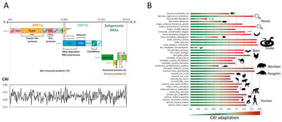 (A) Genome organization of SARS-CoV-2 and corresponding Codon Adaptation Index (CAI) with human genome. The numbers of proteins for Non-structural, Structural and Accessory proteins are indicated in parenthesis. (B) SARS-CoV-2 CAI (ORF-size weighted average) with respect to various species.