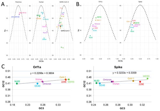 If GC3s is the only determinant factor shaping codon usage, the Nc values would align with a dotted theoretical curve representing random codon usage [] (Figure 3A,B). Assuming that (G + C) compositional constraints are the exclusive determinant of codon usage, GC3s and Nc values should exhibit a correlation that aligns with or deviates downward from the predicted expected trend. Throughout the spectrum of Nc values ranging from 20 to 61, a value of 20 signifies the highest degree of codon bias, while a value of 61 indicates no codon bias whatsoever. Substantial codon usage bias is typically indicated by an Nc value ≤ 35 in a coding sequence. The Nc–GC3s plot is widely used to distinguish whether codon usage in genes is primarily influenced by mutation (points near the expected curve) or also by other factors like selection (points significantly below the expected curve). When the Nc and GC3s values were plotted for the individual SARS-CoV-2 ORFs (Figure 3A, right), all points, except for ORFs 7a and 10, lied below the expected random curve, indicating that G + C compositional constraints might significantly influence SARS-CoV-2 codon usage. The deviation of almost all SARS-CoV-2 ORFs from the random curve towards the lower Nc values suggests that not only mutation but also other factors, such as translational selection, are likely to be involved in determining the selective constraints on codon bias in SARS-CoV-2 genes towards a preferred and limited set of codons. As a reference to the human genome, translational selection is much more pronounced in housekeeping genes [] such as Globin, Myosin, and Tubulin than in poorly expressed human genes (DHX9, DDX58, IFN-beta, or KAL) as outlined in the corresponding Nc plot (Figure 3A, center). Accordingly, the weighted average for all SARS-CoV-2 ORFs (black dot with Nc = 45.1 and GC3s = 0.28 in Figure 3A) markedly differs from other RNA viruses, such as the Flaviviridae Zika virus ORFs (Figure 3A, left), that also have a bias towards A-ending codons [,,], showing a much lower GC content and overall Nc value for SARS-CoV-2, stressing again the unique codon-wise characteristics of SARS-CoV-2. The same analysis was performed for Orf1a and Spike gene segments of various coronaviruses (Figure 3B) including SARS-CoV-2 (Wuhan initial reference isolate and Omicron recent isolate), SARS-CoV-1, MERC-CoV, and various hCoV lineages (229E, OC43, and NL63). We observed that all points representing different strains were lower than the standard curve for both genes, Orf1a showing more dispersion on the Nc axis than Spike. Additionally, with the exception of SARS-CoV-2 Orf1a (Wuhan and Omicron), the coronavirus strains were not clustered together, highlighting again that mutational pressure combined with other factors may have contributed to the codon usage bias of SARS-CoV-2. The Spike Nc plot shows more clustering between strains, revealing less bias between strains for this gene segment, with a potential higher contribution of mutational pressure to the Spike codon bias. This was further confirmed with the complementary neutrality plot analyses (Figure 3C), which revealed the greater contribution of mutation pressure to Spike than to Orf1a CUBs (Spike:32% >> Orf1a:23%), while the relative constraints on GC3 (natural selection) being the main evolutionary force driving CUB is conversely higher for Orf1a (Orf1a:77% >> Spike:68%).