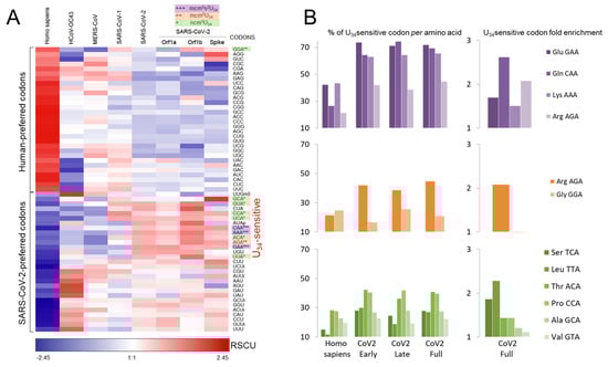 (A) Hierarchical cluster analysis of RSCU for human coronavirus (HCoV-OC43, MERS-CoV, SARS-CoV-1, and SARS-CoV-2) and SARS-CoV-2 (Wuhan reference genome) longest ORFs (encoding non-structural genes (Orf1a an Orf1b) and structural gene Spike). Average linkage WPGMA (weighted pair group method with averaging) was used as the agglomeration method. U34-sensitive codons are color-coded. (B) Usage of U34-sensitive codons in human host and SARS-CoV-2 genome. Data are expressed in % of U34-sensitive codons for each amino acid analyzed, for either early SARS-CoV-2 genes (i.e., non-structural genes), late SARS-CoV-2 genes (i.e., structural genes), or the full viral genome. Fold enrichment of each U34-sensitive codon was deduced using human U34-sensitive codon frequencies per amino acid as reference.