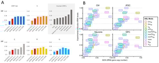 tRNA Adapatation Index (tAI) of Coronavirus. (A) Calculations performed with stAIcalc software version 1.0 July 2016 (http://tau-tai.azurewebsites.net, accessed on 11 July 2023) using human tRNA gene copy number retrieved from the genomic tRNA database (http://gtrnadb.ucsc.edu, accessed on 22 June 2022), for non-structural (ORF1ab) or structural (S, E, M, N) ORFs of coronaviruses infecting bat (RaTG13) and human (hCoV 229E, hCoV OC43, SARS-CoV-1, MERS-CoV, and SARS-CoV-2). For comparison, tAI of human ORFs encoding highly abundant proteins (Protein Abundance Database (https://pax-db.org, accessed on 27 August 2023)) were calculated. Histogram of SARS-CoV-2 appears shaded in red. (B) Correlation between normalized human tRNA gene copy number (GCN) and normalized experimental anticodon tRNA expression level in human primary cells derived from iPSC cells (CM, cardiomyocytes; NPC, neuronal progenitor cells), based on the data from Gao et al. (2024) []. Anticodons are color-coded with respect to tRNA modifications occurring at position 34.