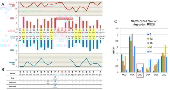 Among the SARS-CoV-2 ORFs, the region encoding the spike protein has been extensively studied as it mediates attachment to the host cell by binding to the ACE2 membrane protein and facilitates viral fusion to the host cell membrane following efficient cleavage by furin proteases [,]. Early examination of the Wuhan SARS-CoV-2 isolate revealed an unusual furin-like cleavage site at the S1/S2 junction of the spike ORF [,]. This site, created by the insertion of a 4-amino acid sequence (PRRA), corresponds to the insertion of 12 nucleotides (...U CCU CGG CGG GC...) absent from all other sarbecoviruses, including the closely related bat sarbecovirus RaTG13 with ~96% genome sequence identity [,] (Figure 6A). In SARS-CoV-2, the furin site insertion lies in a region where codons are moderately adapted to the human host, as depicted by the CAI curve. Most codons in this region are commonly used in the virus genome (high RSCU), except for the arginine dicodon (CGG CGG (R R)). Interestingly, the corresponding unique CGG codon is less preferred than AGA in SARS-CoV-2 (SARS-CoV-2 RSCUCGG = 0.17, SARS-CoV-2 RSCUAGA = 2.63)), which is not the case in the human genome (human RSCUAGA = 1.29, human RSCUCGG = 1.21) (Figure 6C). During the pandemic, mutations impacting the furin site have been rare, suggesting a strong purifying selection in humans [,]. However, non-arginine residues in the PRRAR motif remain permissive to potential optimization during human viral evolution in different variants of concern and interest (Figure 6B). This complex interplay between codon usage and furin site evolution warrants further investigations to unravel its significance in SARS-CoV2’s origins.