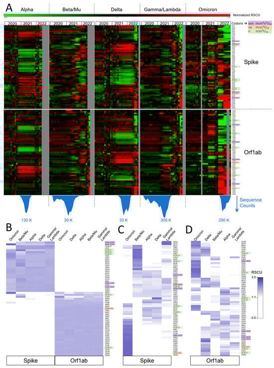 (A). SARS-CoV-2 codon bias variation over time. RSCUs for Spike and Orf1ab were calculated from the various clade sequences extracted from the Fumagalli group’s paper [] and analyzed over time for each clade using cluster analysis (using Genesis software). Sequence count profiles are shown beneath each clade time scale to trace each clade expansion. (B). Comparison of RSCUs at the expansion peak of each clade. Cluster analysis was established for both Spike and Orf1ab together (B) or individually (C,D). U34-sensitive codons are color-coded.