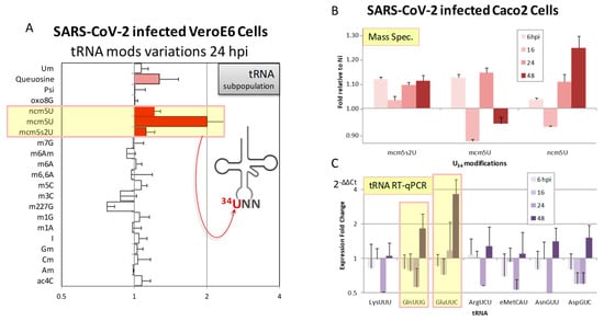 To assess the validity of our hypothesis, we investigated the dynamic changes in tRNA modifications within SARS-CoV-2-infected cells. We first explored by LC-MS/MS the behavior of epitranscriptomic marks in the tRNA subpopulation extracted from SARS-CoV-2-infected VeroE6 cells (Figure 8A). Using this approach, we tracked 21 different tRNA post-transcriptional modifications and discovered that modifications at position 34, including ncm5U, mcm5U, and mcm5s2U, were noticeably increased. We extended our analysis to human Caco2 cells, a more suitable cellular model for exploring SARS-CoV-2 infections given the known COVID-19 gastrointestinal manifestations. Our focus on U34 modifications once again highlighted the early and rapidly changing nature of the three marks we examined (Figure 8B). By simultaneously tracking tRNA levels, we also found that two of the four U34-modified tRNAs (tGluUUG and tGlnUUC) were upregulated at later time points (Figure 8C). Overall, these preliminary results indicate the possible role of tRNA modifications in SARS-CoV-2 infection and reinforce the idea that SARS-CoV-2 can manipulate the host’s tRNA transcriptome. However, it remains unclear whether these changes can genuinely benefit viral infection.
