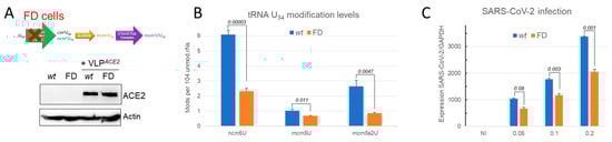 Patient primary fibroblasts were from the Coriell Institute: GMO1652 derived from non-FD control (Skin fibroblast (arm) from 11-year-old Caucasian female); GMO4959 derived from FD patient (Skin fibroblast (arm) from 10-year-old Caucasian female). The SARS-CoV-2 was a French Ile de France isolate (www.european-virus-archive.com/virus/sars-cov-2-isolate-betacovfranceidf03722020, accessed on 8 June 2020). Viral stocks were generated by amplification on VeroE6 cells (epithelial kidney of an African green monkey, ATCC CRL-1586). The supernatant was collected, filtered through a 0.45 µm membrane, and titered using a TCID50 assay. Caco2 cells (epithelial colon adenocarcinoma, ATCC HTB-37) were used for tRNA modification quantification upon SARS-CoV-2 infection.