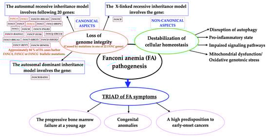 The cellular hallmarks of FA include impaired repair of DNA interstrand cross-linking (ICLs), disruption of DNA replication fork, impaired autophagy and mitophagy (the autophagy of damaged mitochondria), overproduction of proinflammatory cytokines and dysregulation of the redox system [2,9,10,11,12,13]. FA is also characterized by cellular hypersensitivity to exogenous ICL agents, including diepoxybutane (DEB), mitomycin C (MMC), cisplatin, tobacco smoke, etc. [5,7]. Combining all of the above leads to the manifestation of a triad of FA symptoms, including the early onset of bone marrow failure (BMF), a high predisposition to a wide spectrum of malignancies and congenital anomalies [11,14,15]. In addition, FA is the most common form of inherited bone marrow failure syndromes (IBMFS) and chromosome instability syndrome associated with developmental anomalies [16]. Figure 1 summarizes the general concept of FA pathogenesis, including all FA genes, the inheritance pattern, and the two pillars influencing the development of the disease, i.e., loss of genome integrity and destabilization of cellular homeostasis.