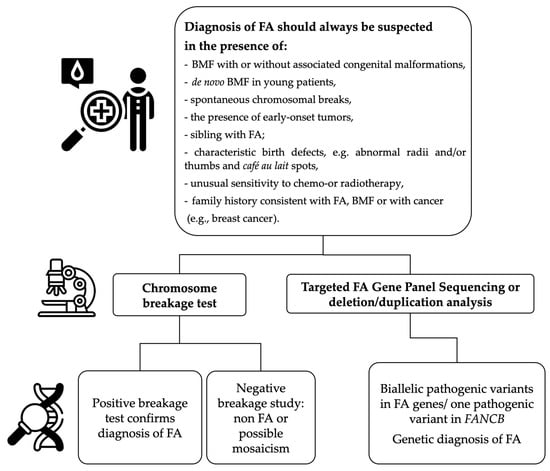 Research endeavors have highlighted substantial heterogeneity in FA development and phenotype, even among patients harboring the same pathogenic variant (PV). Probably other factors may contribute to both hematologic and non-hematologic manifestations of FA, including inflammatory cytokine production, oxidative stress, impaired mitochondrial metabolism or epigenetic factors [23,24]. Additionally, FA is also called a premature-aging state, with high rates of stem cell depletion at birth, high cancer prevalence and a general decline in physical fitness which appear at a young age [25]. Thus, the heterogeneity of the clinical picture of FA may result in a delay in establishing the definitive diagnosis, which strongly affects the future patients’ outcomes [17]. A positive result of the chromosome breakage test confirms the clinical diagnosis of FA and is also an indication to extend the diagnostics with the molecular cytogenetics and molecular methods in order to precisely determine the genetic background of the disease, and detect the type and origin of PV and neoplastic to adequately carry out patients in genetic council clinics [26,27].