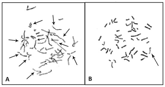 Figure 3 shows examples of metaphase spreads from a patient with FA (picture A) and a healthy subject (picture B). Similar tests can be performed in amniocytes and fibroblasts. Chromosome breakage test is not 100% specific for FA and can produce false-positive results in patients with other chromosome instability syndrome, e.g., Nijmegen syndrome or Warsaw breakage syndrome [26,27,34,39]. Increased chromosome breakage and the above-mentioned chromosome aberrations may be absent or present in only a small percentage of cells in approximately 10–20% of patients with Fanconi anemia, presenting with somatic hematopoietic mosaicism, which is characterized by a parallel presence of cells insensitive and sensitive to DNA ICL agents (MMC, DEB). From this point of view, it is crucial that a laboratory determines the reference values for positive, intermediate and negative results of the chromosome breakage test performed in patients representing a population with suspected Fanconi anemia and a control population [34,39,41].