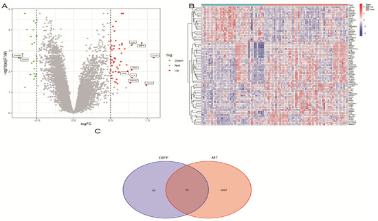 In this study, two microarray datasets, GSE16561 and GSE22255, were merged and analyzed differentially after removing batch effects. A total of 74 differentially expressed genes (DEGs) were identified in the integrated expression matrix by selecting p < 0.05 and |log fold change (FC)| > 0.5 as thresholds (see Supplementary Table S1). Volcano and heat maps were drawn for these differential genes (Figure 1A,B), and DEGs were intersected with MT for analysis, yielding 35 candidate genes (Figure 1C).