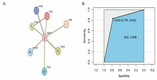 Feature genes. (A) Feature gene PPI network diagram. (B) Area under the blue ROC curve to assess XGBoost prediction accuracy.
