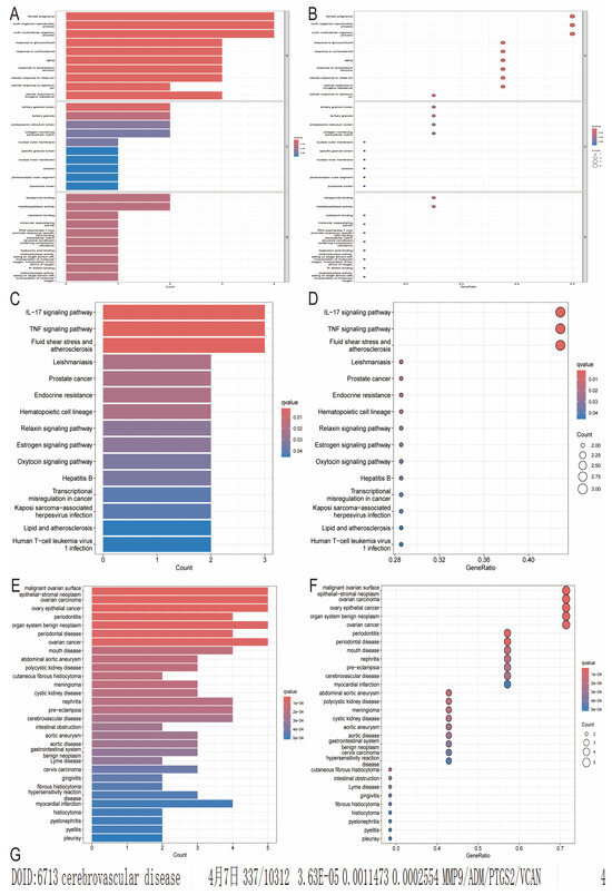 Enrichment of functional DEGs. (A,B) GO analysis. (C,D) KEGG pathway analysis. (E,F) DO analysis. (G) Enrichment of genes. (Non-English terms represent dates of analysed; 7 April).