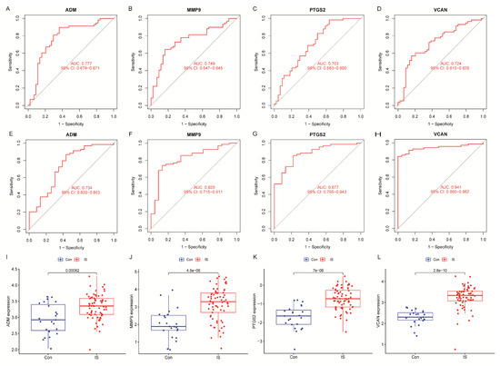 Expression analysis of key genes. (A–D) Screening the AUC of centrally diagnosed IS. (E–H) Validation of the AUC of centrally diagnosed IS. (I–L) Expression levels of four key genes in IS versus control.