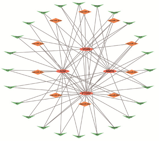 To understand the overall framework of gene regulation and the regulatory relationships, we predicted the potential regulator miRNAs and transcription factors of these hub genes using the NetworkAnalyst database. It was found that miR-144 might simultaneously regulate ADM, PTGS2, and VCAN, while the transcription factor FOS might interact with ADM, PTGS2, and MMP9 (Figure 6). This provided a basis for further elucidation of the gene regulatory network.