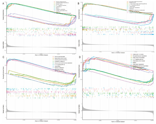 GSEA analysis of hub genes. Top 5 GSEA enrichments in the set of high and low expressed genes for (A) ADM, (B) PTGS2, (C) VCAN, and (D) MMP9.