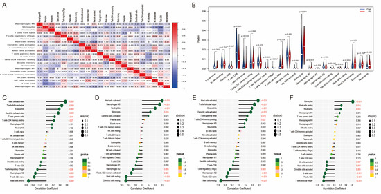 Distribution of immune cells in IS. (A) Correlation analysis of hub genes with immune cells. (B) Differences in infiltrating immune cells between IS and controls. (C) ADM, (D) PTGS2, (E) VCAN, and (F) MMP9 correlation with immune cells.