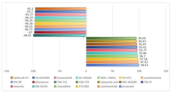 Drug prediction. CMAP instances by compound and cell line organization showing the most significant positive and negative correlation scores for IS effects. Correlation scores are shown on both sides, indicating the strength of the association.