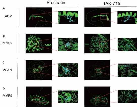 Molecular docking patterns of prostratin and TAK-715 with four target proteins. Binding effects of (A) ADM, (B) PTGS2, (C) VCAN, and (D) MMP9 with prostratin and TAK-715.