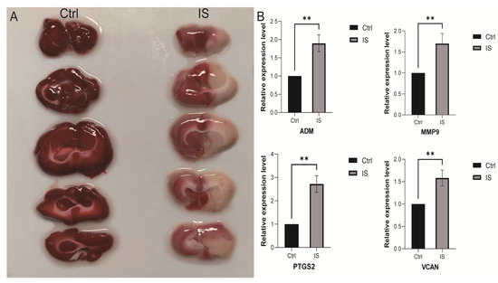 qPCR analysis. (A) TTC staining of rat brain injury, (B) gene expression levels of ADM, MMP9, PTGS2, VCAN in IS and ctrl. ** p < 0.01 versus Ctrl.
