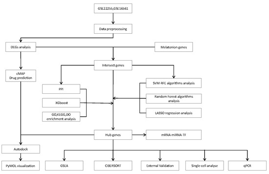 In this study, we aimed to investigate the role of melatonin-related genes (MT) in the pathogenesis of IS by analyzing peripheral blood samples from stroke (IS) and normal controls. We obtained three microarray datasets (GSE22255, GSE16561, and GSE58294) and one single-cell RNA sequencing (scRNA-seq) dataset (GSE174574) from the GEO database. Meanwhile, we obtained the melatonin-related (MT) gene set from the Coremine Medical database. Among them, GSE22255 and GSE16561 were used as screening datasets, and GSE58294 and GSE174574 were used as validation datasets. After the steps of data pre-processing, batch effect correction, and expression value aggregation, we obtained the final gene expression matrix. Details are shown in Supplementary Table S1, and the overall study flow is shown in Figure 14.