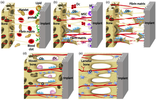 Schematic presentation of the process of implants osseointegration. The process of osseointegration includes the formation of the blood clot and fibrin matrix (a). Angiogenesis and woven bone formation (b). Distance osteogenesis and contact osteogenesis (c). Newborn woven bones fill up the gap, and bone is remodeling (d). Woven bones transform into lamellar bones (e). Dc, decomposed clot; M, macrophage; MSC, mesenchymal stem cell; N, neutrophil; O, osteocyte; Ob, osteoblast; Oc, osteoclast [6] (With permission from Ref. [6]; License Number: 5781780427577, License date: 4 May 2024).