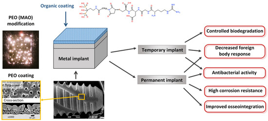 This strategy is summarized in Figure 2. The metal implant either of a temporary, or of a permanent type, is coated by the PEO modification following the biomimetic approach. Further, the top organic coating provides specific chemical and biological properties to the surface.