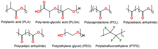Structure of synthetic biodegradable polymers: polylactic acid (PLA), poly(lactic-co-glycolic) acid (PLGA), polycaprolactone (PCL), poly(sebacic anhydride), poly(adipic anhydride), poly(ethylene glycol) (PEG) and polytetrafluoroethylene (PTFE).