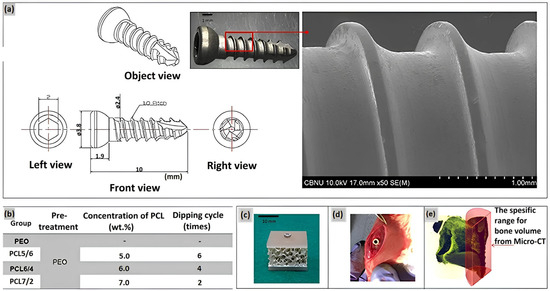 (a) Design of the screw and surface morphology; (b) Conditions of coating the PEO Mg screw by PCL, (c) artificial bone plate model for the immersion test, (d) in vivo model in a rat tibia, and (e) bone volume measurement range [32].