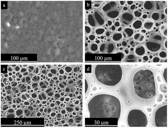Secondary electron plan view micrographs of PEO-PCL coatings. (a) Mg-PEO-PCL without porosity; (b–d) Mg-PEO-PCL-BF at different magnifications [34]. (With permission from Ref. [34]; License Number: 501904643, License date: 8 May 2024).