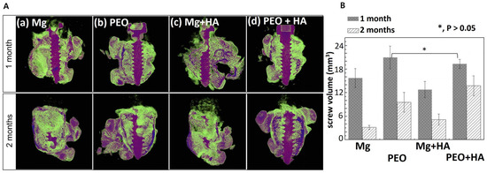 In vivo study of Mg screws with PEO/HYA/CMC coating. Micro-CT image of rat femur with screw (A) and screw volume by micro-CT (B) after implantation for 1 and 2 months [25]. (With permission from Ref. [25]; License Number: 501904646, License date: 8 May 2024).