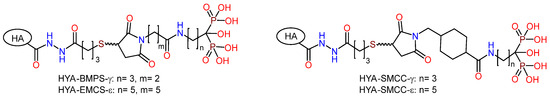 Hyaluronic acid. To obtain new biocompatible coatings on nanostructured (nano-Ti) and coarse-grained titanium (CG-Ti), the PEO sublayer was modified with bisphosphonic derivatives of natural hyaluronic acid (HYA-PH) [80]. The incorporation of phosphonate groups into the biopolymer structure was driven by the necessity to enhance the affinity of organic molecules for the oxidized metal surface and the adsorption of calcium ions. Hyaluronic acid derivatives (HYA-PH) were synthesized through the reaction of maleimide bisphosphonates of γ-aminobutanoic and ε-aminocaproic acids with SH-functionalized HYA (Figure 10). The formation of a combined coating on the surface of PEO-modified titanium was achieved through the application of organic layers due to physicochemical adsorption from aqueous solutions. The study of the biological activity demonstrated that the compounds were nontoxic; their introduction into the PEO coating resulted in a reduction in the viability of fibroblasts (by 20–40%), osteoblast-like cells (by 30–60%), and MSC (by more than 60%) on the surface. This effect appears to be due to the known ability of polysaccharides, particularly glycosaminoglycans, to form a hydrophilic hydrating layer on the surface, which prevents proteins from adsorbing on the surface, thus conferring antifouling properties [4,93]. Furthermore, a significant decrease in the adhesion of P. aeruginosa, S. aureus, and E. faecium bacteria on the surface of PEO-modified titanium containing HYA derivatives was observed. It has been shown that the use of nanostructured titanium leads to an increase in the content of small pores on the PEO-modified surface, which, combined with an organic coating, results in a reduction of pathogen adhesion by up to 84%.