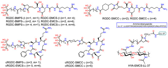 Taking into account the selectivity of cyclic forms of RGD peptide towards integrins and their high enzymatic stability, derivatives of the cyclic peptide c(RGDfC) (cyclo(-Arg-Gly-Asp-D-Phe-Cys)) were synthesized (cRGD-PH); in the molecules, the peptide fragment was conjugated with bisphosphonates of γ-aminobutyric and ε-aminocaproic acids through BMPS, EMSC, and SMCC linkers (Figure 11) [84]. Studies of the proliferation and viability of fibroblasts, mesenchymal stem cells, and osteoblast-like cells in vitro have demonstrated that the biological activity of molecules is dependent on their structure. c(RGDfC) has been shown to reduce cell surface viability, probably due to toxicity. The introduction of the linker and bisphosphonate anchor into the structure of the molecule resulted in a reduction in the toxicity of cyclo-RGD. However, only the ε-aminocaproic acid derivative with the SMCC linker was able to enhance the degree of proliferation of fibroblasts and mesenchymal stem cells on the surface of coarse-grained or nanostructured titanium.