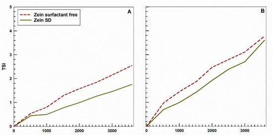 Turbiscan stability index (TSI) profile of surfactant-free and SD-stabilized zein NPs (2 mg protein/mL water). (A): 25 °C; (B): 37 °C.
