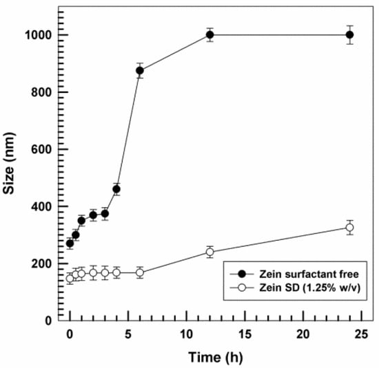 In view of a future use in vivo, the stability of zein NPs in biological fluids was examined. It was previously reported that zein NPs stabilized with SD incubated with 70% FBS at 37 °C maintain their average size (≤200 nm) up to 24 h, while the surfactant-free NPs showed a constant increase in their mean diameters []. Here, surfactant-free and SD-coated zein NPs were incubated in human serum. In line with previous results [], no substantial changes in their mean diameters were observed for SD-stabilized zein NPs up to 24 h of incubation with human serum at 37 °C, while the surfactant-free NPs showed a massive size increase (Figure 3).