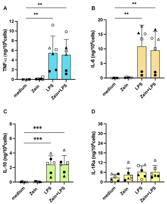 Primary innate immune response of human monocytes to zein NPs, LPS, or their mixture. Human blood monocytes were exposed in culture to medium alone or containing zein NPs (100 ng/mL), LPS (1 ng/mL), or zein NPs + LPS. The levels of inflammatory (TNFα, IL-6; panels (A,B)) and anti-inflammatory cytokines (IL-10, IL-1Ra; panels (C,D)) were measured in the 24 h supernatants via ELISA. The columns represent the average value + sd from 6 individual donors. The individual values are indicated with different symbols. Statistical significance: *** p < 0.001 and ** p < 0.01 in the comparisons between medium vs. LPS and NPs + LPS. All other comparisons (medium vs. NPs, LPS vs. NPs + LPS) are not significant.