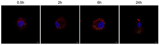 We first evaluated the uptake of zein NPs by monocyte-derived macrophages. Cells were incubated with rhodamine labeled-zein NPs (25 ng/mL) for different periods of time (0.5, 2, 6, 24 h), in order to assess the cell-entry kinetics and persistence of zein inside the cells. Fluorescence microscopy analysis showed that zein NPs were rapidly internalized by macrophages (0.5 h) and persisted within cells throughout the entire experimental time (Figure 6).