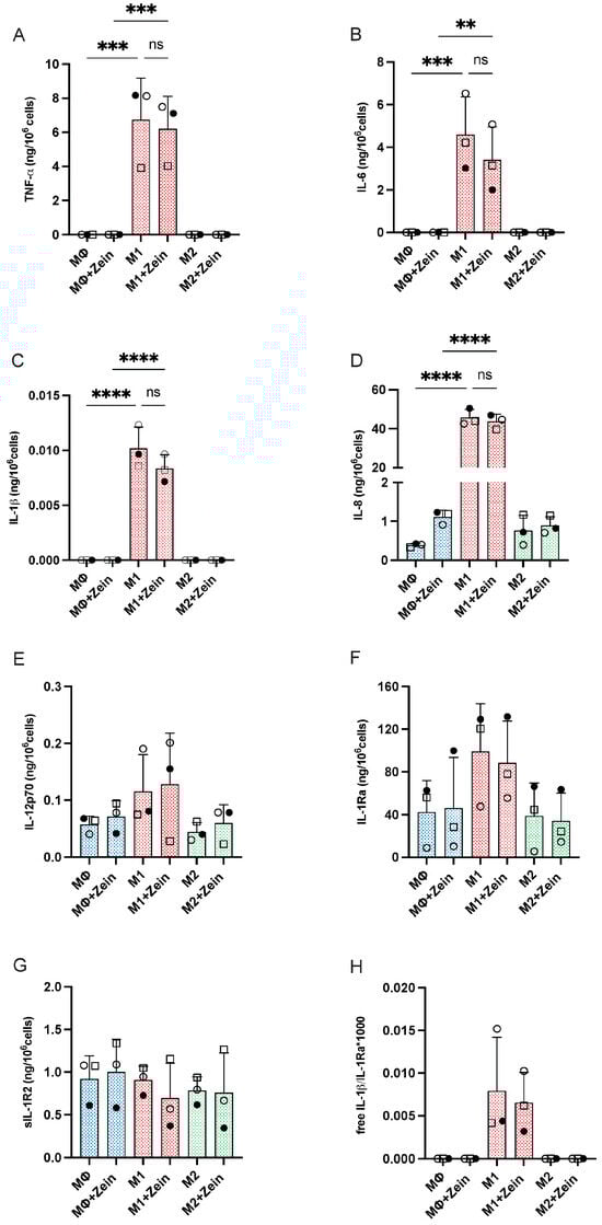 Effect of zein NPs on human macrophage polarization. Monocyte-derived macrophages were either left untreated (naïve, 24 h in culture medium alone—MΦ) or polarized toward the M1 or the M2 functional phenotypes (by 24 h exposure to LPS + IFN-γ for M1, and IL-10 for M2) in the absence or in the presence of 100 ng/mL zein NPs. The production of cytokines and other inflammation-related factors was measured via ELISA in the 24 h supernatants: (A), TNFα; (B), IL-6; (C), IL-1β; (D), IL-8; (E), IL-12p40; (F), IL-1Ra; (G), sIL-1R2. Panel (H) reports the calculated free active IL-1β, i.e., the ratio between free IL-1β (the fraction of the cytokine not bound by its inhibitory receptor sIL-1R2) and the receptor antagonist IL-1Ra multiplied by 1000. The columns represent the average value + sd from 3 individual donors. Individual values are shown by different symbols. Statistical significance: ** p < 0.01 MΦ + Zein vs. M1 + Zein for IL-6; *** p < 0.001 MΦ vs. M1 for TNFα and IL-6. MΦ + Zein vs. M1 + Zein for TNFα; **** p < 0.0001 MΦ vs. M1 or MΦ + Zein vs. M1+Zein for IL-8 and IL-1β. Other comparisons (M1 or M2 vs. M1 + NP or M2 + NP, MΦ vs. M2) are not significant.