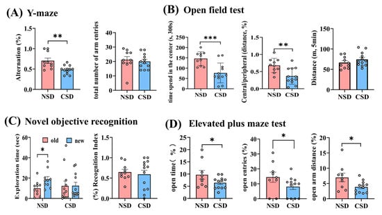 Utilizing the natural exploratory activity of rodents, a spontaneous alternation Y-maze test was employed to assess spatial learning memory capacity in CSD mice []. Both the total number of arm entries and the rate of spontaneous alternation were measured. The results revealed significantly lower alternation rates in CSD animals compared to non-sleep deprivation (NSD) mice (Figure 1A). This suggested cognitive–behavioral impairments in CSD mice. However, the total number of arm entries, indicative of locomotor ability, remained consistent across both groups, implying that locomotor capacity did not influence alternation behavior. New object recognition experiments were conducted to evaluate short-term memory capacity in sleep-deprived (SD) mice []. NSD mice demonstrated a stronger interest in the new object, spending significantly more time exploring it compared to the old one (Figure 1C). In contrast, no preference was observed in CSD mice, indicating impaired short-term memory. In the open field experiment, which assesses motor function and anxiety, no significant difference was observed in the total distance traveled between CSD and NSD mice (Figure 1B). However, significantly lower movement time and a decreased ratio of movement distance in the center to the periphery were exhibited by CSD mice, suggesting the development of anxiety-like behaviors. Furthermore, in the elevated plus maze test (Figure 1D), decreased frequency of entry into the open arm and reduced time spent moving within it were observed in CSD mice, indicating increased anxiety-like behavior. These findings suggested that CSD in mice led to cognitive–behavioral abnormalities resembling AD and anxiety-like moods.