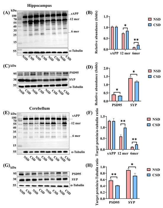 Effects of CSD on Aβ oligomerization and synaptic damage in the hippocampus and the cerebellum. Aβ oligomer expression in the hippocampus (A) and cerebellum (E) detected by Western blot (WB). Protein levels of PSD95 and SYP in the CSD and NSD groups in the hippocampus (C) and cerebellum (G) based on WB results. Bar graphs illustrate the protein expression levels of Aβ oligomers in the hippocampus (B) and cerebellum (F). Bar graphs illustrate the protein expression levels of PSD95 and SYP in the hippocampus (D) and cerebellum (H). All data are presented as mean ± SEM, * p ≤ 0.05, ** p ≤ 0.01, compared with the NSD group; unpaired t-test analysis.