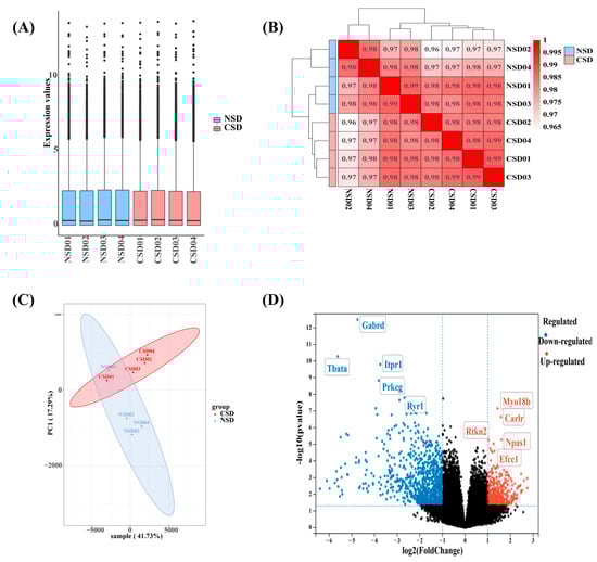 Results of RNA-seq data analysis after 6 months of sleep deprivation in the cerebellum. (A) Box plot displaying the level of gene expression in each sample. (B) Clustering heatmap based on correlation among samples. (C) Plots of principal component analysis (PCA) illustrating the relationship among eight samples. (D) Volcano plot showing differentially expressed genes meeting the criteria of p-value < 0.05 and fold change > 2.0. Red dots represent up-regulated genes in CSD vs. NSD, blue dots represent down-regulated genes in CSD vs. NSD, and black dots represent genes that were not differentially expressed in CSD vs. NSD.