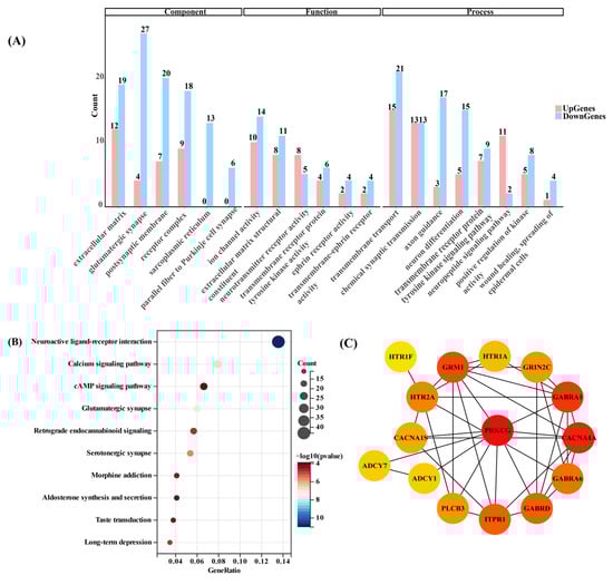 To explore the regulatory function of CSD on cognitive impairment in mice, gene ontology (GO) enrichment analysis of DEGs in the cerebellar regions was conducted. A total of 2672 GO entries were enriched, with the top 6 entries based on DEGs categorized into biological process (BP), molecular function (MF), and cellular component (CC) (Figure 4A). GO functional analysis identified 1850 BP terms, 499 MF terms, and 323 CC terms (Table S1). Notably, terms such as “transmembrane transport”, “chemical synaptic transmission”, and “neuron differentiation” were among the most significantly enriched BP entries, while “extracellular matrix”, “glutamatergic synapse”, and “postsynaptic membrane” were notable CC entries. In terms of MF, “ion channel activity” and “neurotransmitter receptor activity” were highly enriched. Furthermore, KEGG pathway enrichment analysis using the clusterProfiler package revealed significant enrichment of DEGs in 274 typical pathways. The top ten pathways with the highest abundance of DEGs, including “neuroactive ligand–receptor interaction”, “calcium signaling pathway”, and “glutamatergic synapse”, were visualized in dot diagrams (Figure 4B). Specifically, 29 related DEGs were identified in the calcium signaling pathway, with 11 up-regulated and 18 down-regulated genes, while 19 genes were affected in the glutamatergic synapse pathway.