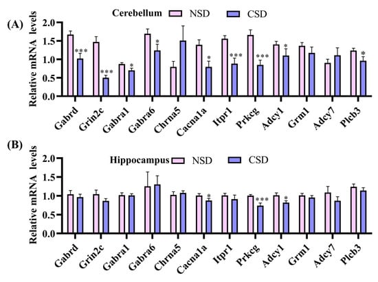 Validation of mRNA expression of 12 hub genes screened in cerebellum (A) and hippocampus (B). (* p ≤ 0.05, *** p ≤ 0.001, compared with the NSD group; unpaired t-test analysis).