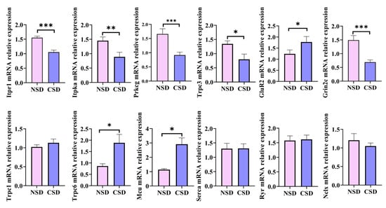 RT-qPCR validation of calcium signaling-related gene expression. (* p ≤ 0.05, ** p ≤ 0.01, *** p ≤ 0.001, compared with the NSD group; Unpaired t-test analysis).