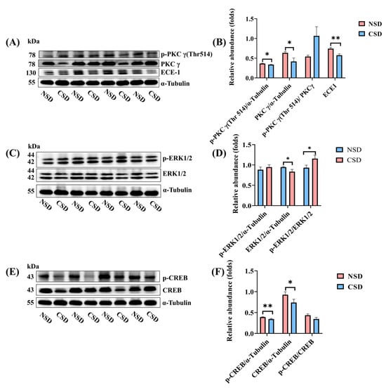 Chronic sleep deprivation affected the PKCγ/ERK/CREB signaling pathway in the cerebellum. (A,B) Representative Western blots and quantification of phosphorylated PKCγ, total PKCγ, ECE1, and their ratio in cerebellar extracts from NSD and CSD mice. (C,D) Representative Western blots and quantification of phosphorylated ERK, total ERK, and their ratio in cerebellar extracts from NSD and CSD mice. (E,F) Representative Western blots and quantification of phosphorylated CREB, total CREB, and their ratio in cerebellar extracts from NSD and CSD mice. All data are presented as mean ± SEM, * p ≤ 0.05, ** p ≤ 0.01, compared with the NSD group; unpaired t-test analysis.