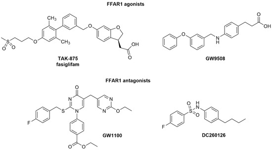 Over the years, several FFAR1 ligands endowed with antagonist and partial/full agonist activity have been identified (Figure 1). Among these, only the partial agonist TAK-875/fasiglifam and JTT-851, a Japan tobacco derivative (unpublished structure), reached late phase III and phase II clinical trials, respectively [16]. However, side effects did not allow the trials to proceed, highlighting the need to identify more effective and safer FFAR1 candidates. In this context, our group has identified oleic acyl derivatives as FFAR1 ligands by combining two dietary compounds, such as quercetin and oleic acid [17].