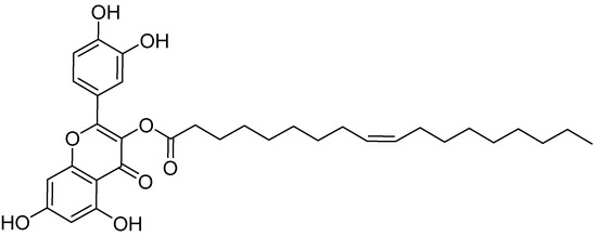 In fact, selective acylation of quercetin phenolic hydroxyls with natural acids represented a valid approach to modulate its biological activity and overcome its poor bioavailability [18]. Accordingly, oleic acid is a valuable acyl-donor, as it is an edible and safe nutrient, endowed with antioxidant, cholesterol, and blood pressure-regulatory activity.