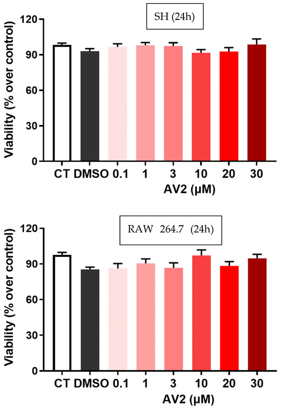 To investigate the biological profile of AV2, cell viability was evaluated in both SH and RAW 264.7 cell lines after treatment with the compound at concentrations ranging from 0.1 to 30 µM. The results showed the safe profile of AV2 as the compound did not modify SH or RAW 264.7 cell viability after 24 h of treatment (Figure 3).
