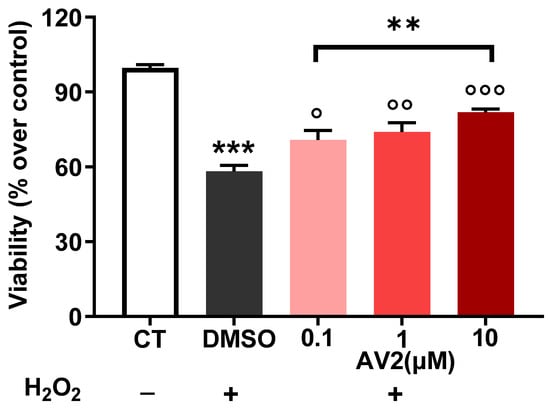 Cytoprotective activity of AV2 in vitro. AV2, at increasing concentrations (red scaling), reduced oxidative stress damage caused by H2O2 after 30 min of treatment in SH cells. Fluorescein diacetate assay was used to measure cell viability. CT: control, taken as 100%. ** p < 0.01, *** p < 0.001 vs. CT; ° p < 0.05, °° p <0.01, °°° p < 0.001 vs. DMSO+ H2O2; (one-way ANOVA p < 0.001; F = 71.96, with multiple comparisons).
